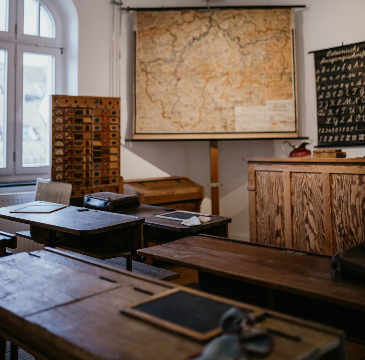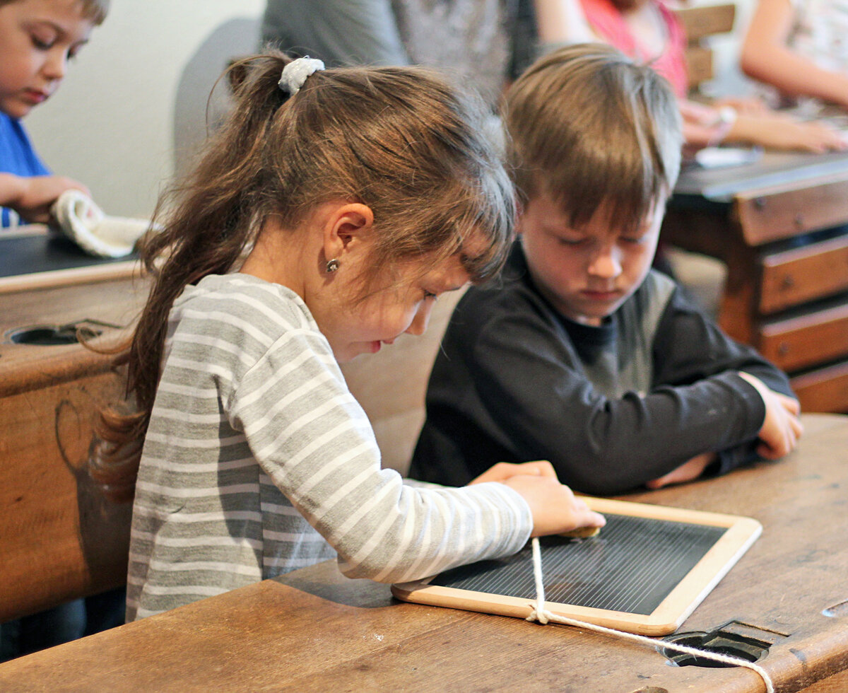 - Spielerisch lernen Kinder interessante Fakten über „Schule früher“ in einem historischen Schulzimmer, das mit originalen Gegenständen aus der Zeit von 1900 bis etwa 1950 eingerichtet ist